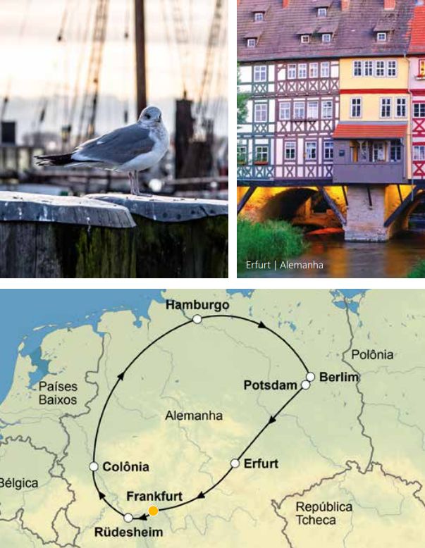 Guia acompanhante bilíngue em espanhol e português do 2° ao 7 dia (motorista-guia para grupos com menos de 8 pessoas). 7 dias de viagem passando por Frankfurt, Rüdesheim, St. Goar, Colônia, Hamburgo, Berlim, Frankfurt (sem hospedagem)