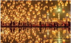 No horário combinado, saída para o Festival das Lanternas: inclui transporte, atividades como Loi Krathong, lanches, entrada para o ritual, cerimônia religiosa, liberação de lanterna flutuante.