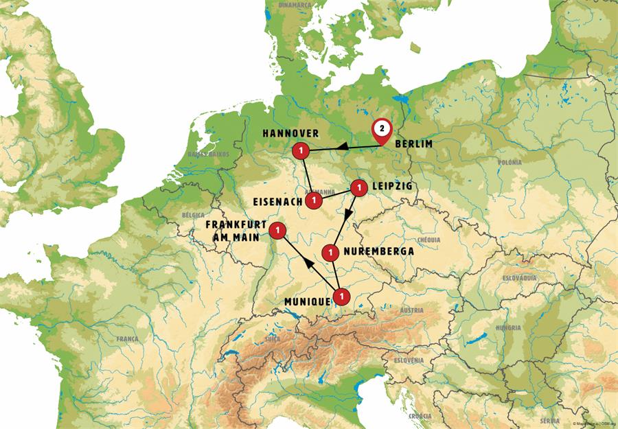 Berlim, wolfsburgo, Celle, Hannover, Goslar, gotinga, bad sooden, Eisenach, Gotha, Erfurt, Leipzig, Dresden, Bamberg, Nuremberg, kloster weltenburg, Dachau, Munique, Füssen, Rotemburgo, Frankfurt.