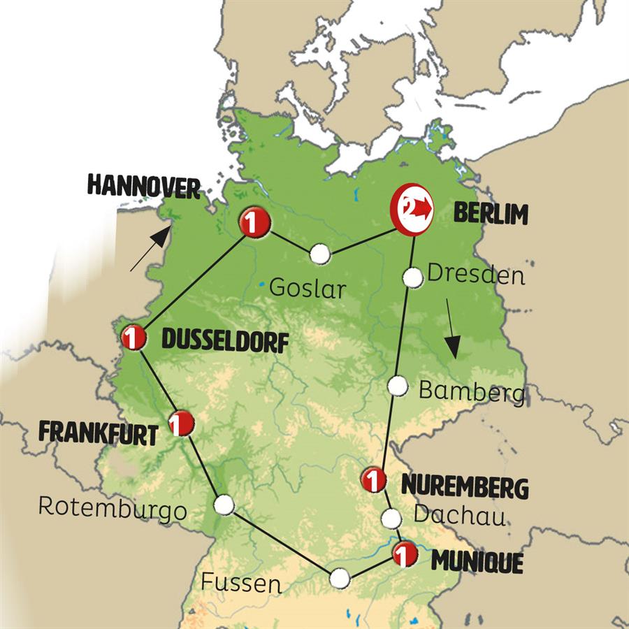 Berlim, Dresden, Bamberg, Nuremberg, kloster weltenburg, Dachau, Munique, Füssen, Rotemburgo, Frankfurt, crucero por el rhin, Colônia, Dortmund, ruta cuentos de hadas, Hannover, Goslar.