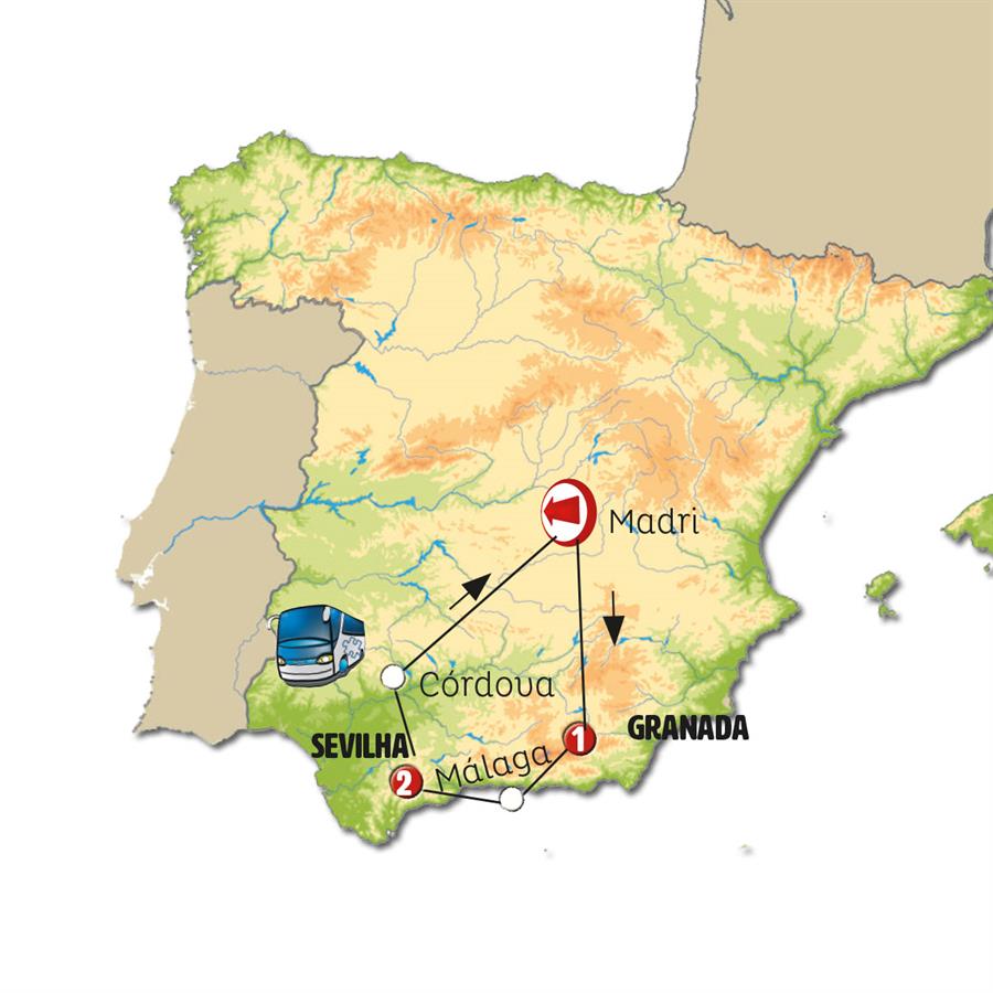 Madrid, Granada, Nerja, Málaga, Ronda, Sevilha, Córdoba, consuegra.