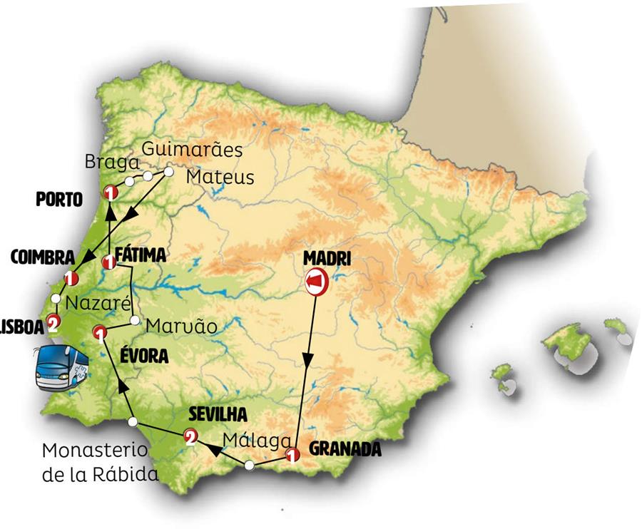 Madrid, Granada, Nerja, Málaga, Ronda, Sevilha, Merida, Évora, Marvão, Castelo de Vide, Tomar, Fátima, Porto, Braga, Santuario do Bom Jesus, Guimarães, Aveiro, Coimbra, Batalha, Nazaré, Óbidos, Lisboa.