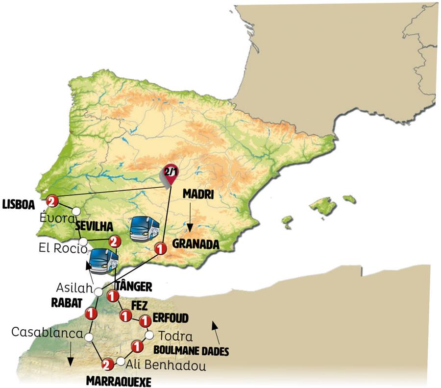 Madrid, Granada, Tânger, assilah, Rabat, Casablanca, Marrakech, ait ben hadu, Ouarzazate, Boumalne Dadès, Todra, Erfoud, Fes, Sevilha, Merida, Évora, Lisboa, Cáceres.