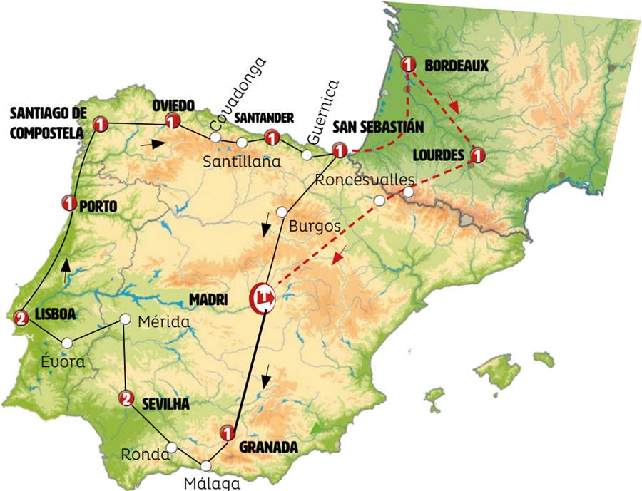 Madrid, Granada, Nerja, Málaga, Ronda, Sevilha, Merida, Évora, Lisboa, Fátima, Porto, Santuario do Bom Jesus, Cambados, Santiago de Compostela, Lugo, Cebreiro, León, Oviedo, Covadonga, Santilhana, Santander, Bilbao, guernica, San Sebastian, Bordeaux, Lourdes, Sallent de Gallego, Zaragoza.