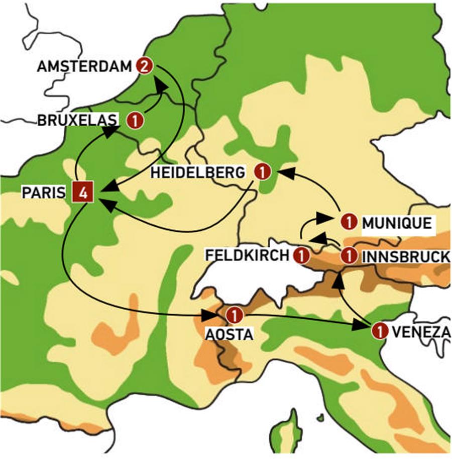Paris, Eperlecques, Calais, Bruges, Gante, Haia, Amsterdã, Delft, Bruxelas, Genebra, Aosta, Veneza, Verona, Lago de Garda, Innsbruck, zugspitze, Feldkirch, Lago Constança , Lindau, Munique, Stuttgart, Heidelberg, Strasbourg.