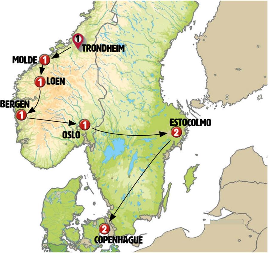 Trondheim, KRISTIANSUND, carretera atlantica, MOLDE, Geiranger, briksdal, Loen, Bergen, Eidfjord, voringfossen, Geilo, Oslo, Orebro, Estocolmo, Helsingor, Copenhague.