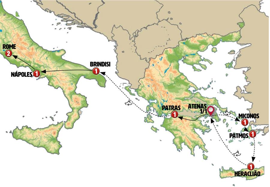 Atenas, miconos, Kusadasi, Patmos, Rodes, Heraclion, Santorini, Tripoli, Olympia, Patras, Igumenitsa, ferri igumenitsa brindisi, Brindisi, Alberobello, Matera, Nápoles, Capri, Pompeia, Roma.