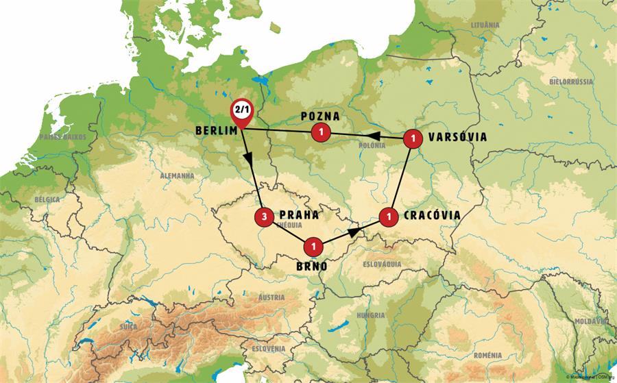Berlim, Dresden, Praga, rBrno, Bratislava, Trencin, Cracóvia, Auschwitz, Czestochowa, Varsóvia, Poznan.