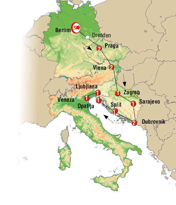 Berlim, Dresden, Praga, Ceske Budejovice, Cesky Krumlov, Viena, Maribor, Zagreb, Banja Luka, jajce, Sarajevo, Mostar, Dubrovnik, Ston, Split, Plitvice, Opatija, postjona, Bled, Liubliana, Veneza.