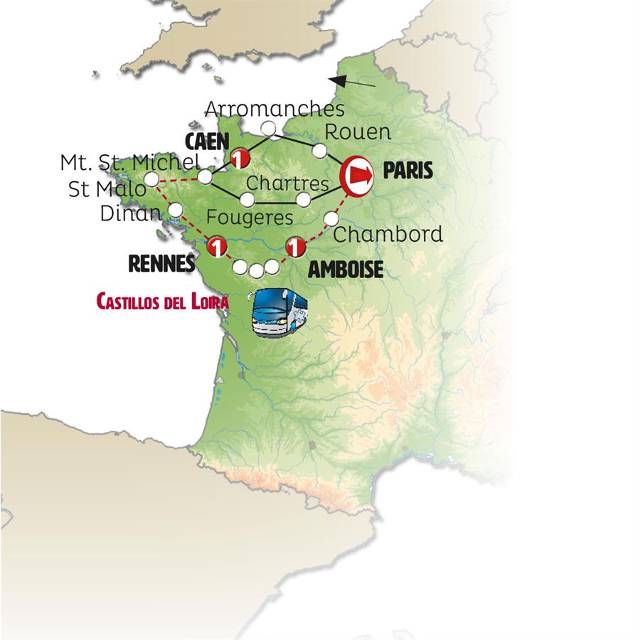 Paris, Rouen, Arromanches, Caen, Mont Saint Michel, Fougeres, Chartres.