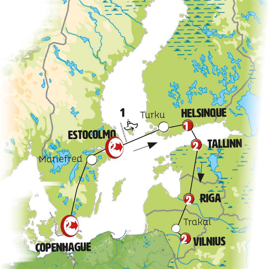 Copenhague, jonkoping, vadstena, Estocolmo, ferri estocolmo turku, Naantali, Helsinki, ferri helsinki tallin, Tallin, Parnu, Turaida, Sigulda, salaspils, Riga, Rundale, Vilnius.