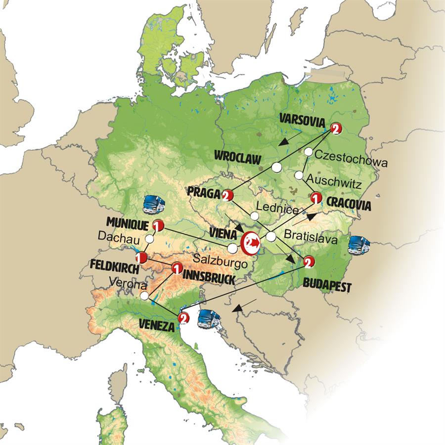 Viena, Bratislava, Trencin, Cracóvia, Auschwitz, Czestochowa, Varsóvia, Wroclaw, Praga, Lednice, Budapeste, region de carintia , Veneza, Verona, Lago de Garda, Innsbruck, zugspitze, Feldkirch, Lago Constança , Lindau, Munique, Salzburgo, St. Wolfgang, Lago Traunsee.