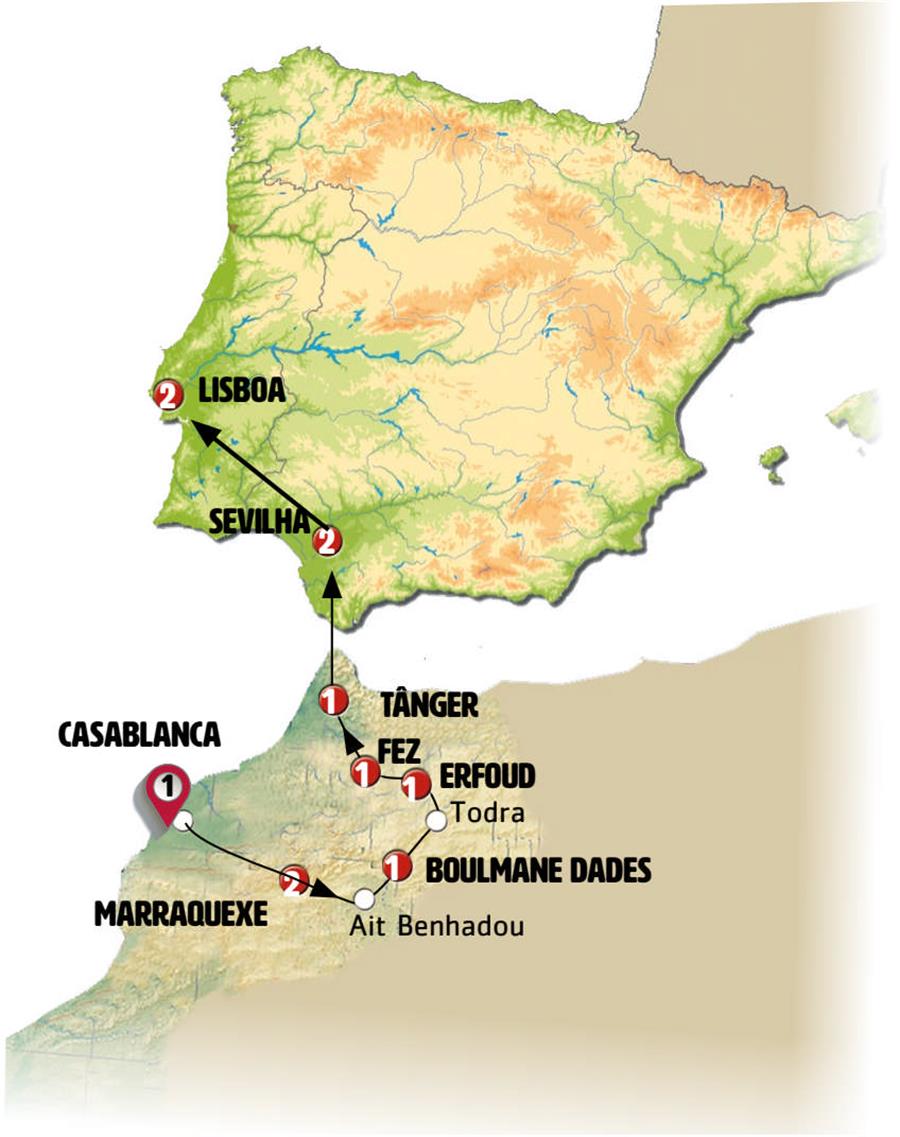 Casablanca, Marrakech, ait ben hadu, Ouarzazate, Boumalne Dadès, Todra, Erfoud, Fes, Tânger, Sevilha, Merida, Évora, Lisboa.