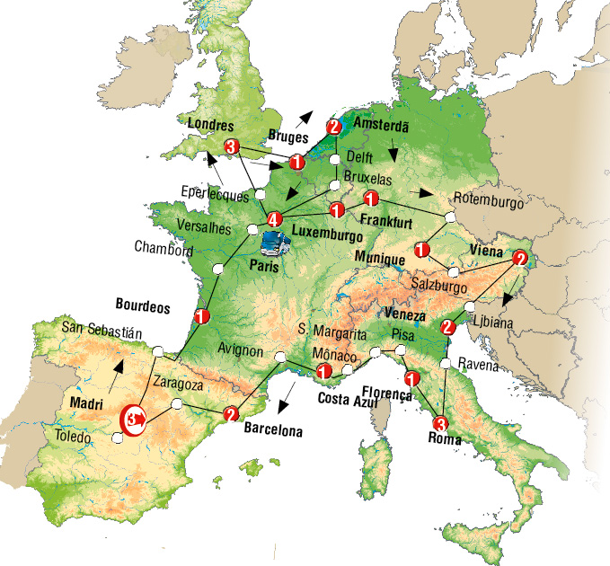 Madrid, San Sebastian, Bordeaux, Chambord, Paris, Canterbury, Londres, canal de la mancha, Bruges, Gante, Middelburg, Roterdã, Amsterdã, kinderdijk, Bruxelas, Bouillon, Luxemburgo, Cochem, crucero por el rhin, Frankfurt, Rotemburgo, Munique, Salzburgo, St. Wolfgang, Lago Traunsee, Viena, Bratislava, region de carintia , Veneza, Ravena, Assis, Roma, Florença, Pisa, SESTRI LEVANTE, Montecarlo, Cote D´azur, Arles, Barcelona, comarca del penedes, Zaragoza.
