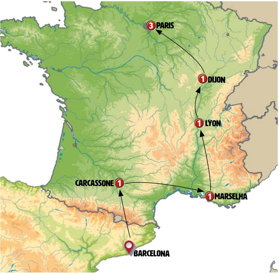 Barcelona, Gerona, Besalu, Collioure, Carcassonne, narbona, Marselha, Arles, Avignon, Lyon, Tournus, castillo de savigny, Beaune, Dijon, abadia de fontenay, semur en auxois, vezelay, Paris.