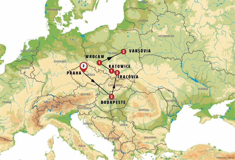 Praga, Lednice, Budapeste, Bratislava, Trencin, Cracóvia, Kalwaria Zebrzydowska, barwald dolny, Wadowice, Auschwitz, Katowice, Opole, Wroclaw, Poznan, Torun, Varsóvia.