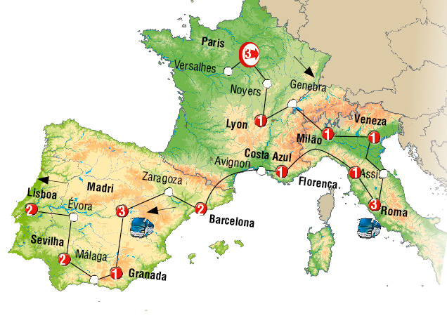 Paris, borgoña, Beaune, Lyon, Genebra, Milão, Veneza, Ravena, Assis, Roma, Florença, Pisa, SESTRI LEVANTE, Montecarlo, Cote D´azur, Arles, Barcelona, comarca del penedes, Zaragoza, Madrid, Granada, Nerja, Málaga, Ronda, Sevilha, Merida, Évora, Lisboa.