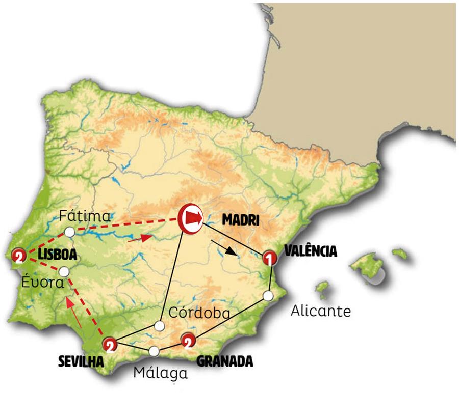 Madrid, Alarcon, Valência, Alicante, Guadix, Granada, Nerja, Málaga, Ronda, Sevilha, Córdoba, consuegra.