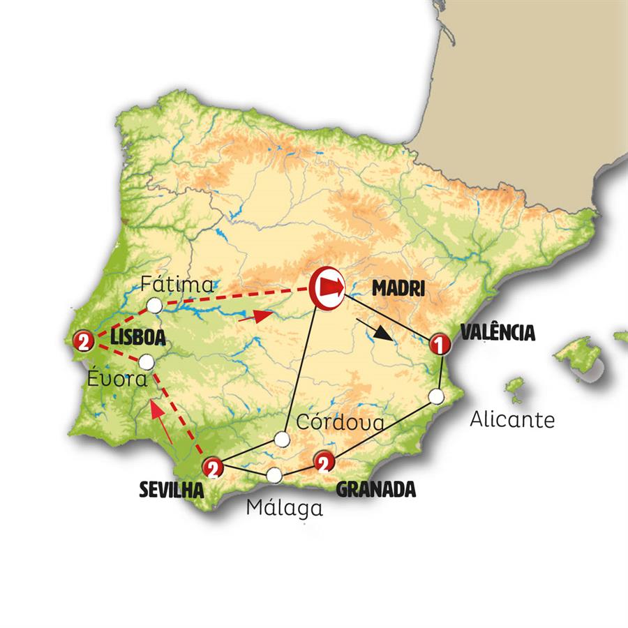 Madrid, Alarcon, Valência, Alicante, Guadix, Granada, Nerja, Málaga, Ronda, Sevilha, Córdoba, consuegra.