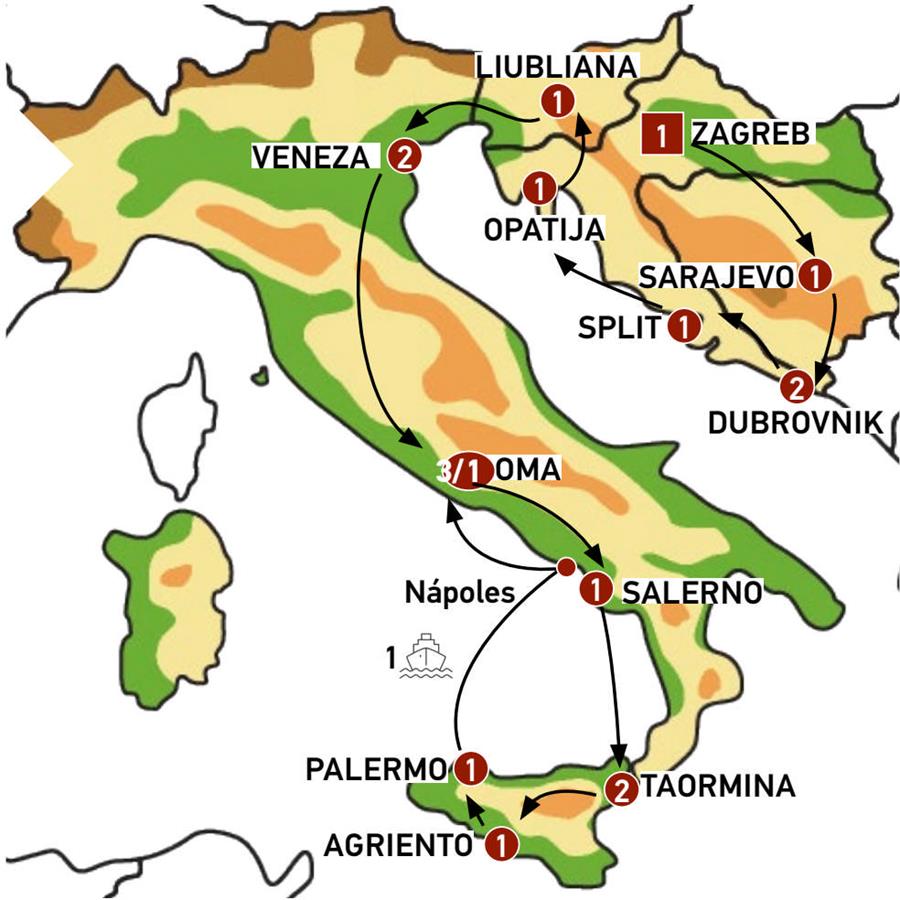 Zagreb, Banja Luka, jajce, Sarajevo, Mostar, Dubrovnik, Ston, Split, Plitvice, Opatija, postjona, Bled, Liubliana, Veneza, Ravena, Assis, Roma, Nápoles, Capri, Sorrento, Salerno, Paola, mesina , Taormina, Catania, Siracusa, Agrigento, Marsala, Érice, Palermo, Monreale, ferri palermo napoles, Pompeia.