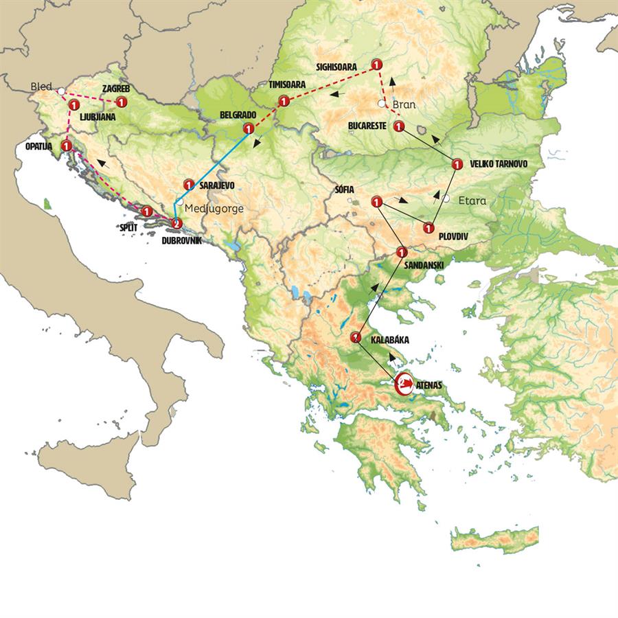 Atenas, Kamena Vourla, Kalambaka, Tesalonica, Melnik, sandansky , Rila, Sofia, Bachkovo, Plovdiv, Kazanlak, shipka, etara, arbanassi, Veliko Tarnovo, basarbovo, Bucareste, Sinaia, Bran, Sighisoara, Biertan, Sibiu, Hunedoara, Timisoara, Belgrado.