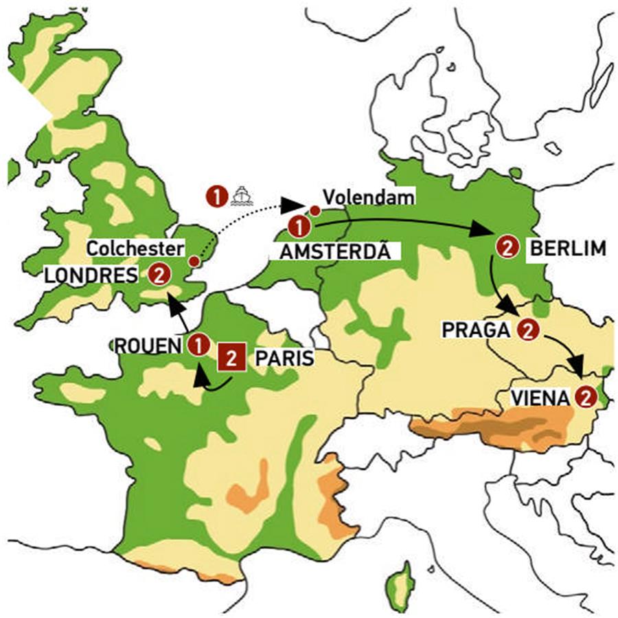 Paris, Rouen, canal de la mancha, Canterbury, Londres, colchester, ferri colchester volendam, Volendam, Amsterdã, Hamelin, Berlim, Dresden, Praga, rBrno, Bratislava, Viena.
