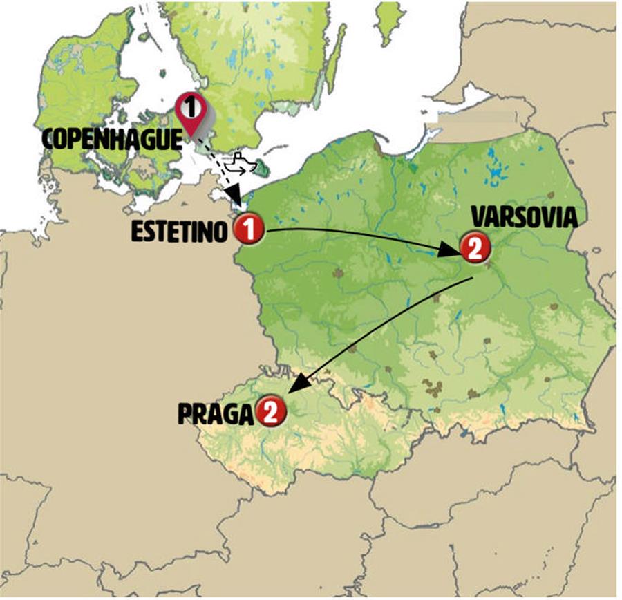 Copenhague, Rostock, Szczecin, Bydgoszcz, Torun, Varsóvia, Wroclaw, Praga.