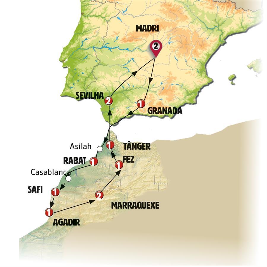 Madrid, Granada, Tânger, assilah, Rabat, Casablanca, El Jadida, Safi, esauira, Agadir, Marrakech, ouzoud, Fes, Sevilha, Córdoba, consuegra.
