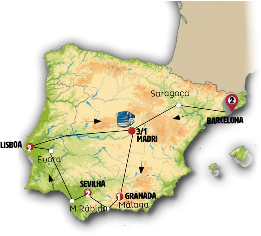Saída de Sevilha, em uma etapa de grande beleza paisagística, entre colinas e oliveiras entraremos em Estremadura. MÉRIDA, entrada incluída para o sítio arqueológico do Teatro e Anfiteatro Romano, excelentemente preservado, Património da Humanidade. Tempo para almoçar e passear no agradável centro histórico pedestre com muita vida e restaurantes. Continuaremos rumo a ÉVORA, cidade declarada Patrimônio da Humanidade com suas ruas brancas, seus palácios renascentistas e sua catedral. LISBOA, chegada prevista para o final do dia.