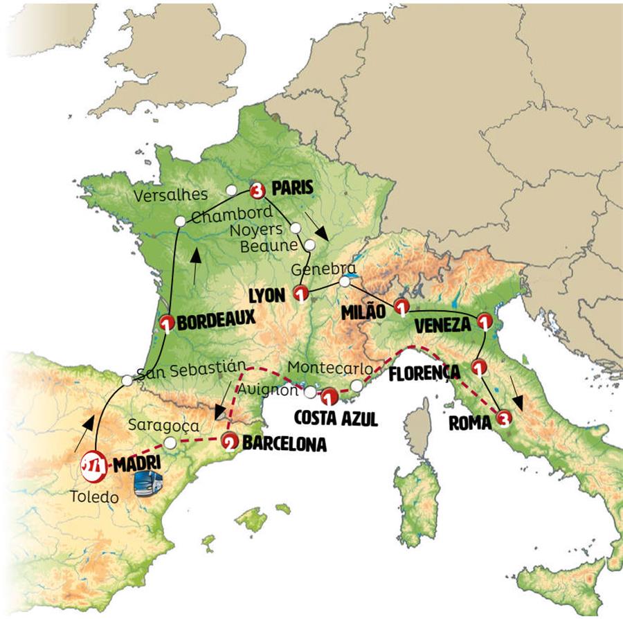 Madrid, San Sebastian, Bordeaux, Chambord, Paris, borgoña, Beaune, Lyon, Genebra, Milão, Veneza, Florença, Siena, Assis, Roma.