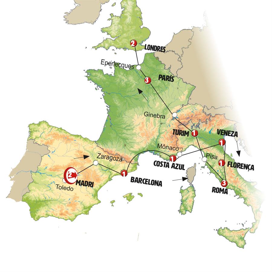 Madrid, Zaragoza, Barcelona, Cote D´azur, Cidade de Mônaco, Gênova, Veneza, Florença, Roma, Pisa, Torino , Genebra, Paris, Canterbury, Londres.