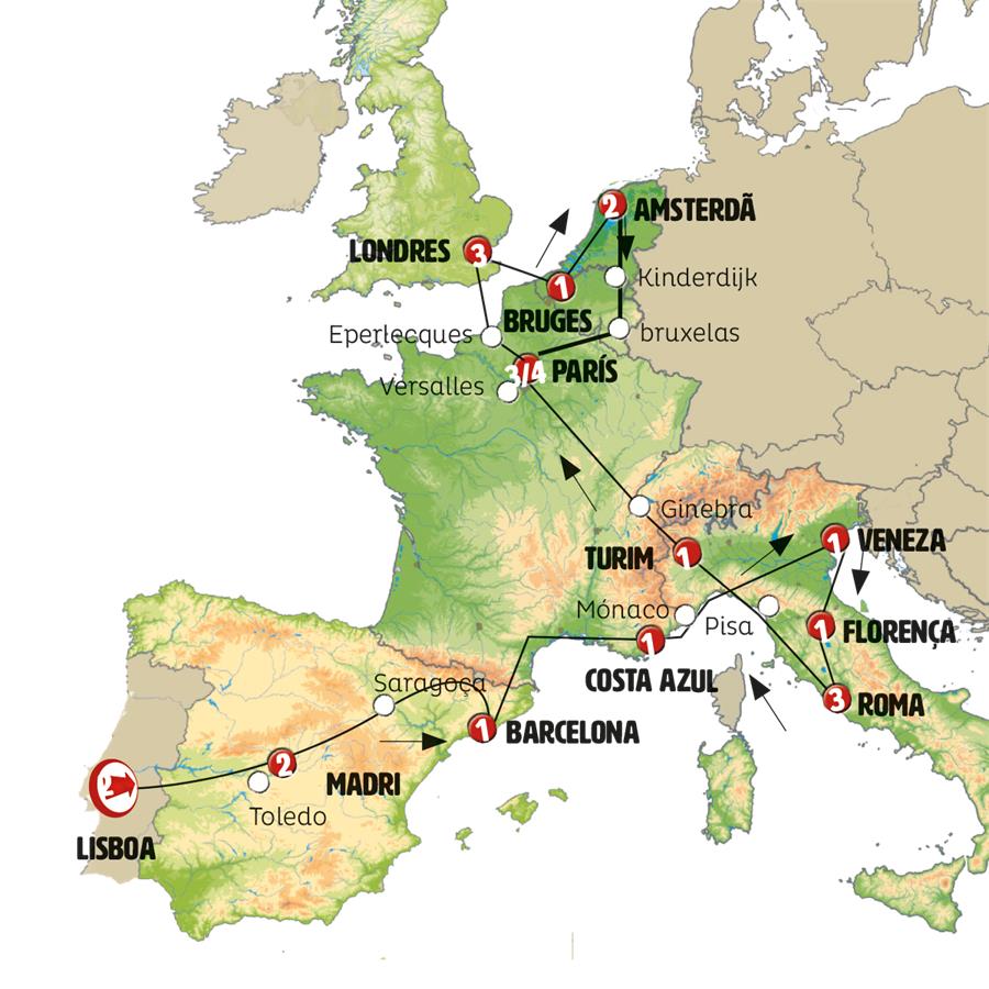 Lisboa, Cáceres, Madrid, Zaragoza, Barcelona, Cote D´azur, Cidade de Mônaco, Gênova, Veneza, Florença, Roma, Pisa, Torino , Genebra, Paris, Canterbury, Londres, canal de la mancha, Bruges, Gante, Middelburg, Roterdã, Amsterdã, kinderdijk, Bruxelas.