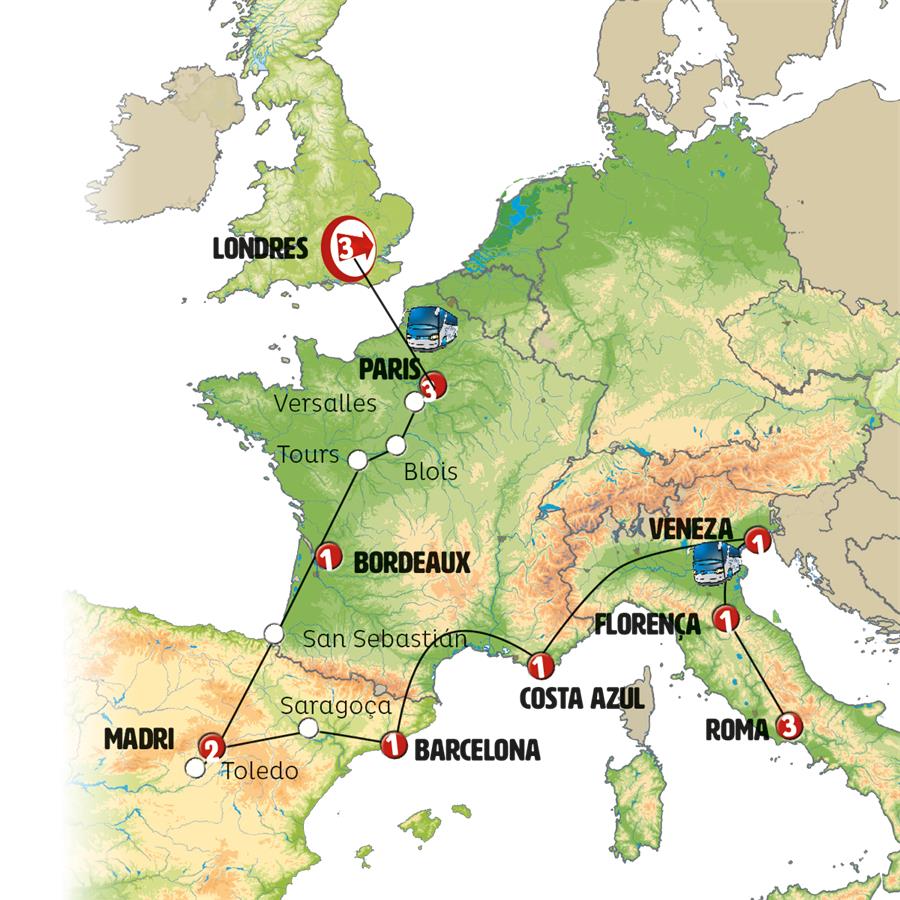 Londres, Calais, Amiens, Paris, Blois, Tours, Bordeaux, San Sebastian, Area de Serviço Foronda, Madrid, Zaragoza, Barcelona, Cote D´azur, Cidade de Mônaco, Gênova, Veneza, Florença, Roma.