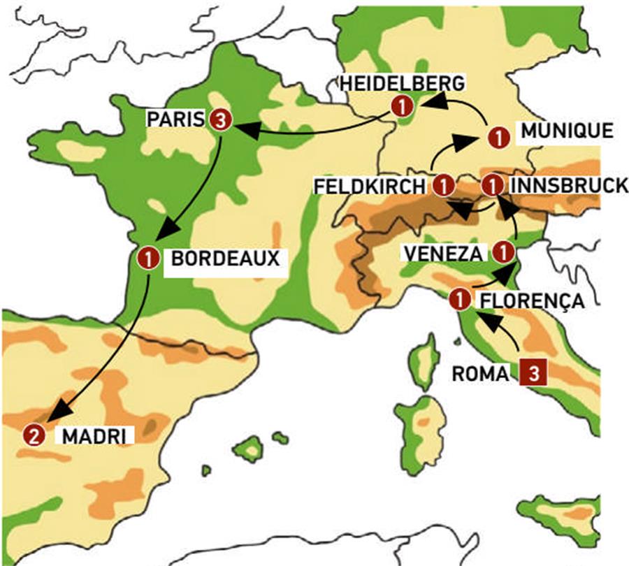 Roma, Florença, Veneza, Verona, Lago de Garda, Innsbruck, zugspitze, Feldkirch, Lago Constança , Lindau, Munique, Stuttgart, Heidelberg, Strasbourg, Paris, Blois, Tours, Bordeaux, San Sebastian, Area de Serviço Foronda, Madrid.
