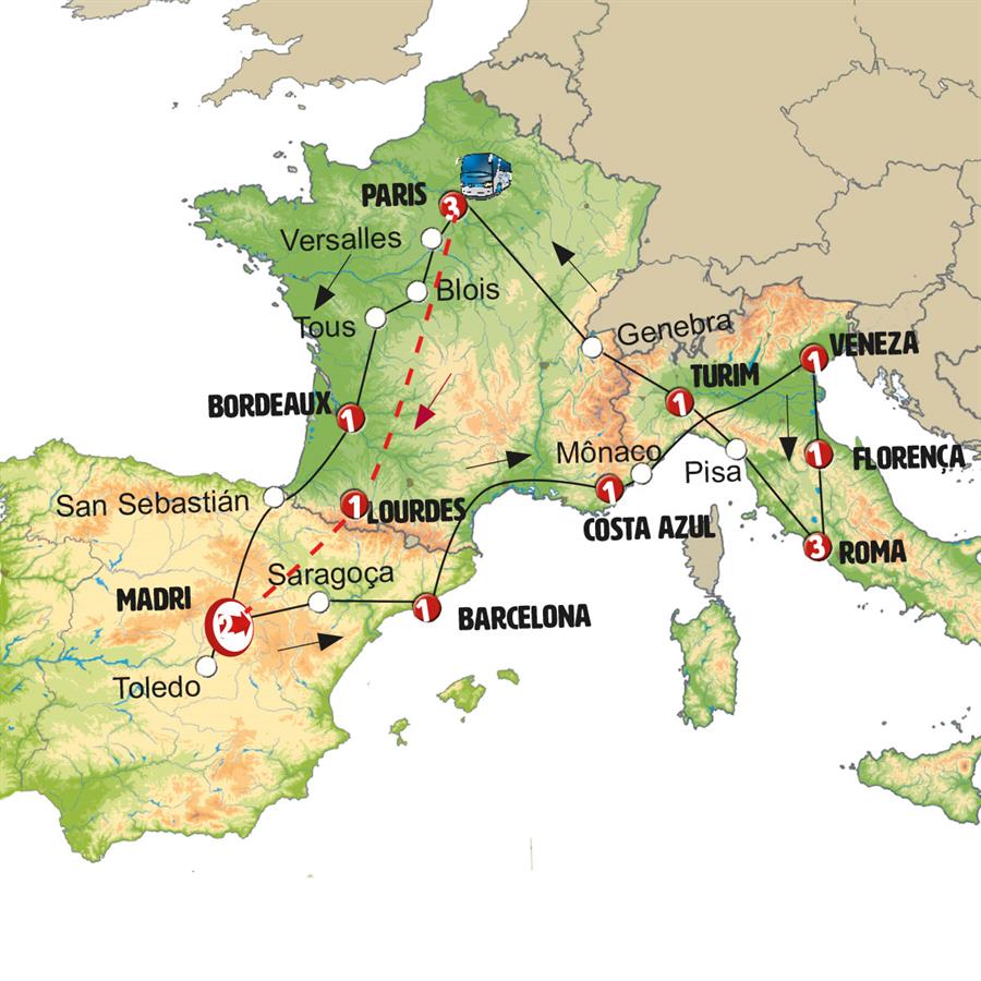 Madrid, Zaragoza, Barcelona, Cote D´azur, Cidade de Mônaco, Gênova, Veneza, Florença, Roma, Pisa, Torino , Genebra, Paris, Tours, Bordeaux, Lourdes, Sallent de Gallego.