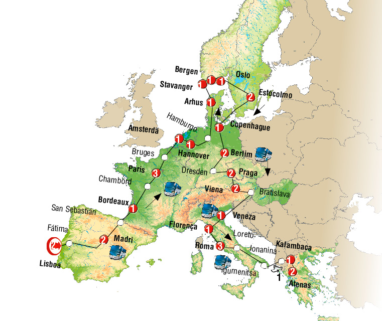 Lisboa, Cáceres, Madrid, San Sebastian, Bordeaux, Chambord, Paris, Bruges, Amsterdã, Hannover, Hamburgo, Flensburg, Arhus, ferri kristiansand, Kristiansand, Stavanger, Bergen, fiordo sogne, Oslo, Orebro, Estocolmo, Helsingor, Copenhague, Berlim, Dresden, Praga.