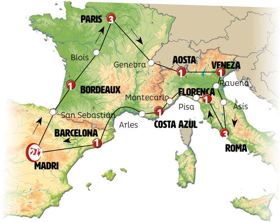 Madrid, San Sebastian, Bordeaux, Blois, Paris, Genebra, Aosta, Veneza, Ravena, Assis, Roma, Florença, Pisa, SESTRI LEVANTE, Montecarlo, Cote D´azur, Arles, Barcelona.