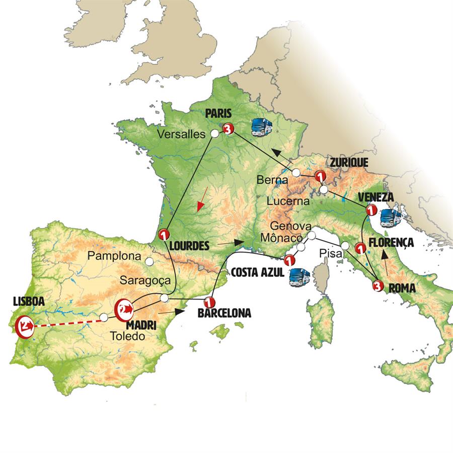 Madrid, Zaragoza, Barcelona, Cote D´azur, Cidade de Mônaco, Gênova, Pisa, Florença, Roma, Bolonha, Ferrara, Veneza, Lugano, Lucerna, Zurich, Strasbourg, Paris, Tours, Bordeaux, Lourdes, Sallent de Gallego.
