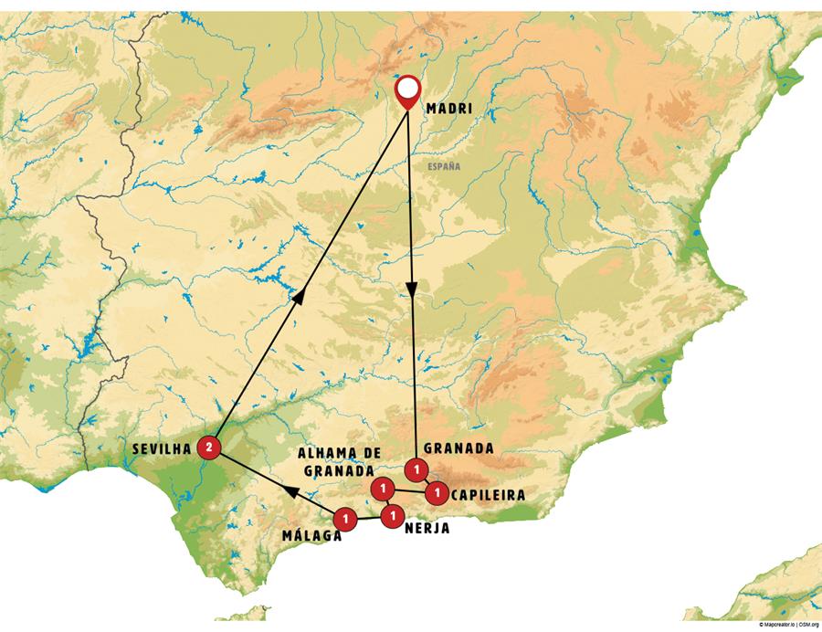 Madrid, Granada, pampaneira, trevelez, capileira, Lanjaron, alhama de granada, Nerja, Frigiliana, Málaga, Ronda, Sevilha, Córdoba, consuegra.