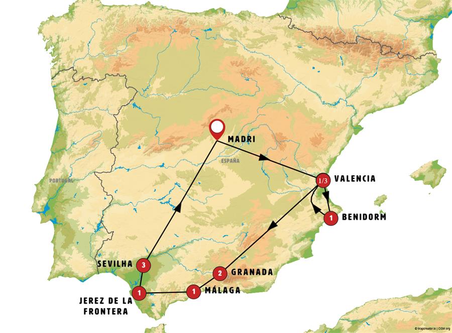 Madrid, Alarcon, Valência, Denia, Benidorm, guadalest, jijona, Alicante, Guadix, Granada, Nerja, Frigiliana, Málaga, Puerto Banus, setenil de las bodegas, Ronda, Jerez de La Frontera, el puerto de santa maria, Cádis, Sevilha, palos de la frontera, Huelva, El Rocio, Córdoba, consuegra.