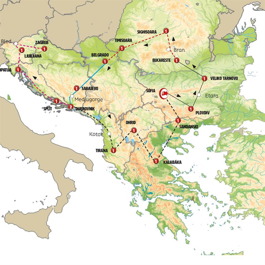 Sofia, Bachkovo, Plovdiv, Kazanlak, shipka, etara, arbanassi, Veliko Tarnovo, basarbovo, Bucareste, Sinaia, Bran, Sighisoara, Biertan, Sibiu, Hunedoara, Timisoara, Belgrado, sremska mitrovica, republica de srpska, Sarajevo, Mostar, herzegovina, Dubrovnik.
