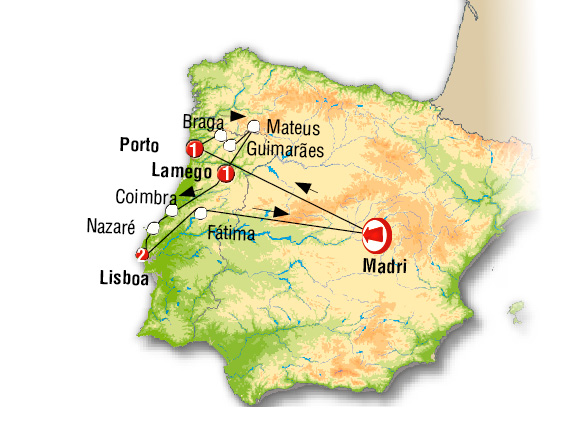 Madrid, Cidade Rodrigo, Porto, Braga, Santuario do Bom Jesus, Guimarães, Aveiro, Coimbra, Batalha, Nazaré, Óbidos, Lisboa.
