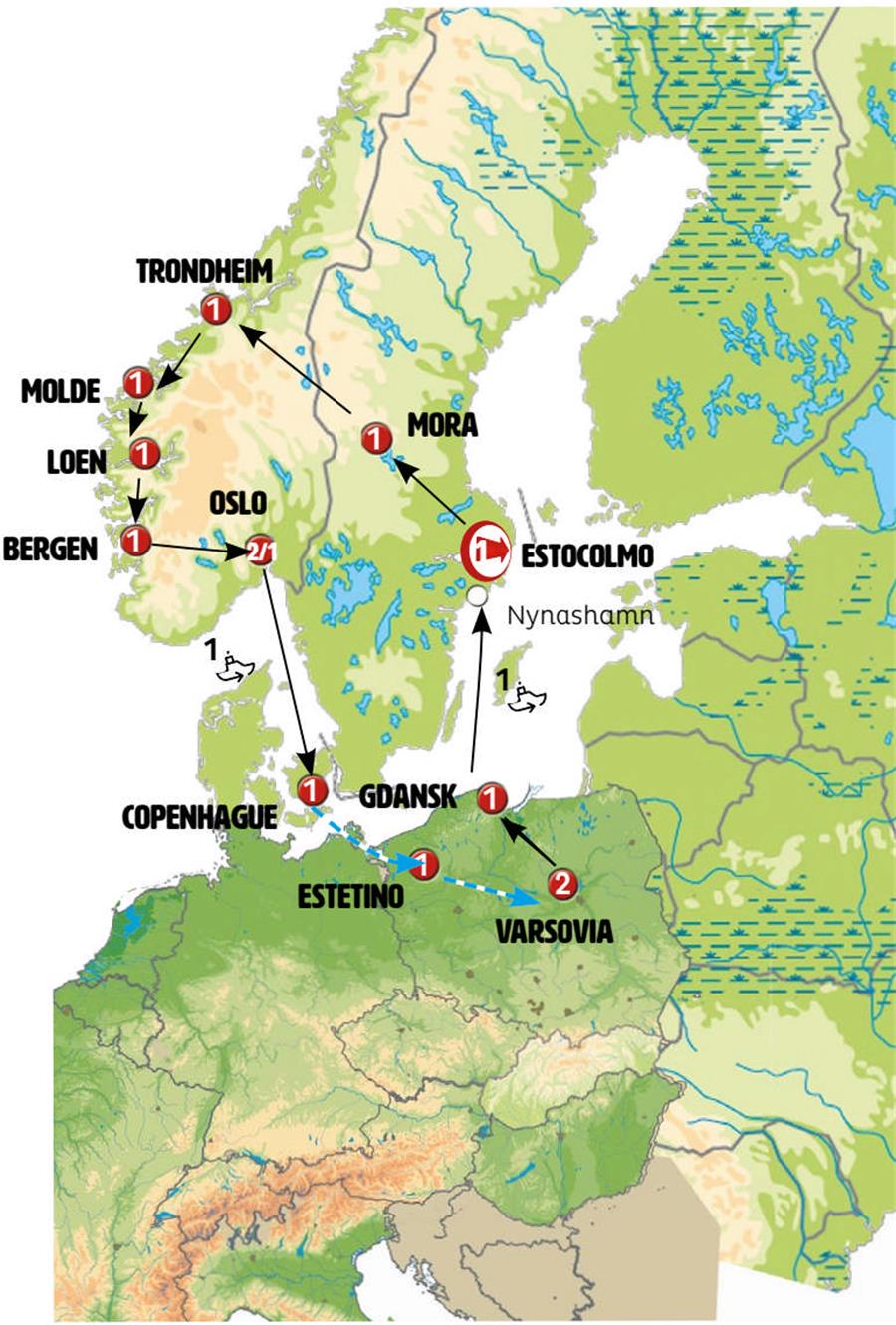 Estocolmo, Mora, funasdalen, Roros, Trondheim, KRISTIANSUND, carretera atlantica, MOLDE, Geiranger, briksdal, Loen, Bergen, Eidfjord, voringfossen, Geilo, Oslo, ferri oslo copenhague, Copenhague, Rostock, Szczecin, Bydgoszcz, Torun, Varsóvia.