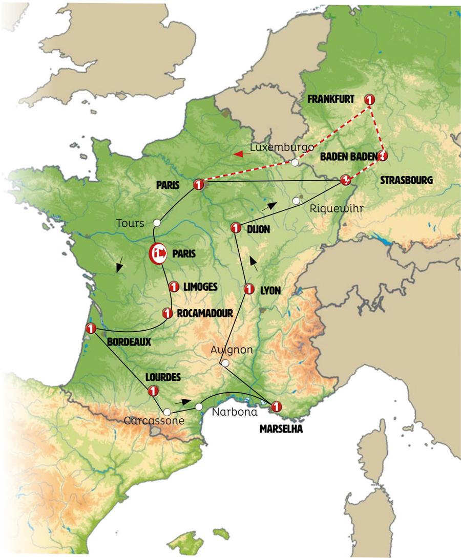 Paris, Blois, Tours, Villandry, Amboise, Chenonceaux, Chambord, Limoges, Sarlat, beynac et cazenac, Rocamadour, Caverna de Padirac, collonges la rouge, Saint Emilion, Bordeaux, Lourdes, Carcassonne, narbona, Marselha, Arles, Avignon, Lyon, Tournus, castillo de savigny, Beaune, Dijon, besanzon, Colmar, Riquewihr, Strasbourg, friburgo de brisgovia, Triberg, Gengenbach, baden baden, espira, Heidelberg, Frankfurt, Luxemburgo, Reims.