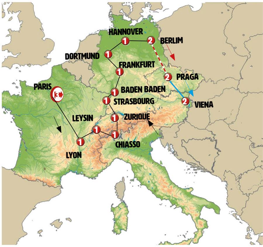 Paris, borgoña, Beaune, Lyon, Genebra, lausana, Gruyeres, friburgo, Interlaken, aareschlucht, Lugano, chiasso, Bellinzona, Altdorf, Lucerna, Zurich, basilea, Colmar, Riquewihr, Strasbourg, friburgo de brisgovia, Triberg, Gengenbach, baden baden, espira, Heidelberg, Frankfurt, crucero por el rhin, Colônia, Dortmund, ruta cuentos de hadas, Hannover, Goslar, Berlim.