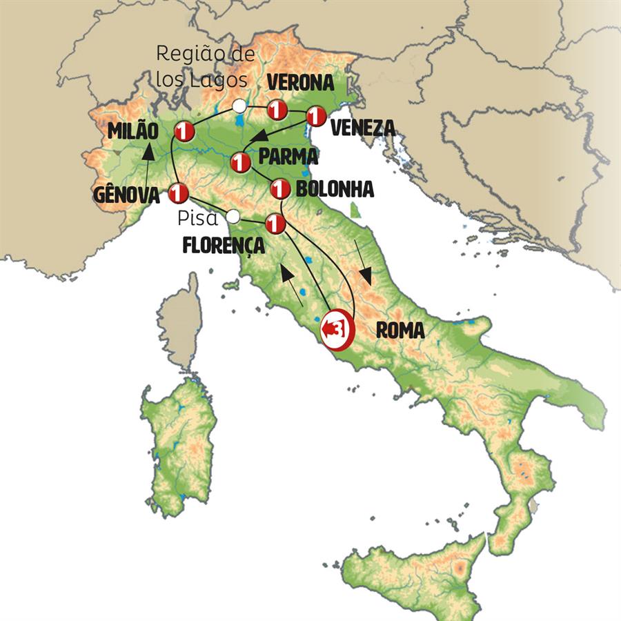Roma, Florença, Pisa, Cinque Terre, Gênova, Portofino, Milão, Região dos Lagos, Verona, Veneza, Ferrara, Modena, Bolonha.