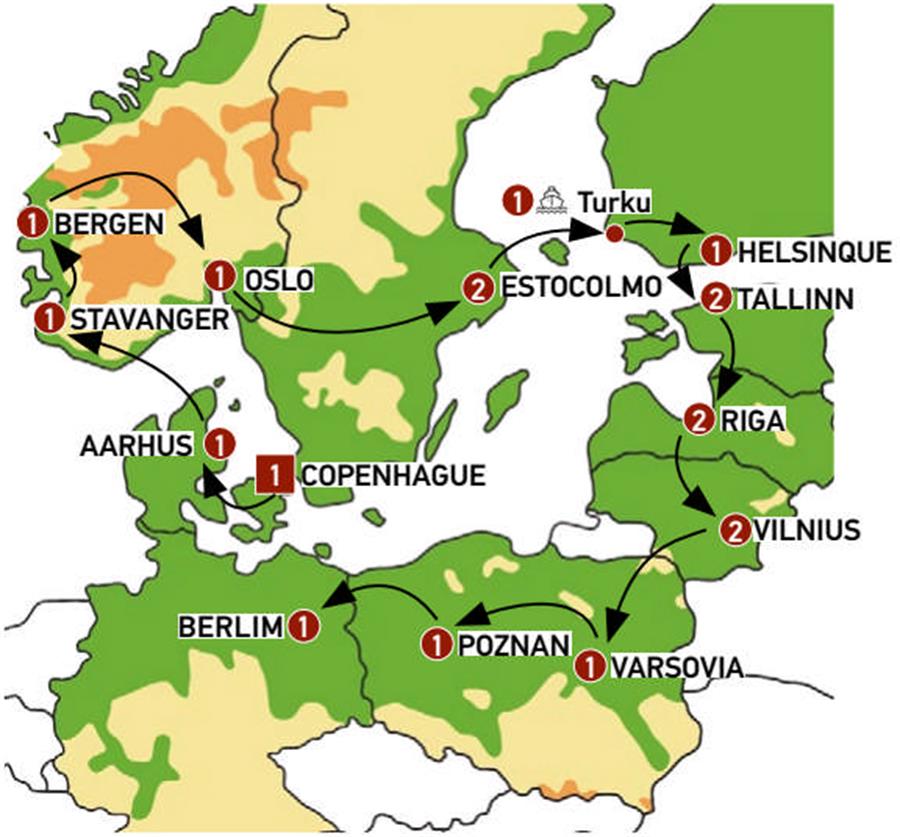 Copenhague, Odense, Arhus, ferri kristiansand, Kristiansand, Stavanger, Bergen, fiordo sogne, Oslo, Orebro, Estocolmo, ferri estocolmo turku, Naantali, Helsinki, ferri helsinki tallin, Tallin, Parnu, Turaida, Sigulda, salaspils, Riga, Rundale, Vilnius, Grutas Park, Augustow, Varsóvia, Poznan, Berlim.