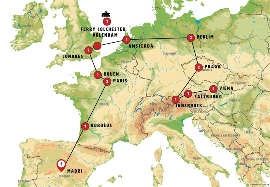 Madrid, San Sebastian, Bordeaux, Chambord, Paris, Rouen, canal de la mancha, Canterbury, Londres, colchester, ferri colchester volendam, Volendam, Amsterdã, Hamelin, Berlim, Dresden, Praga, Munique, Innsbruck, Salzburgo, Lago Traunsee, Viena.