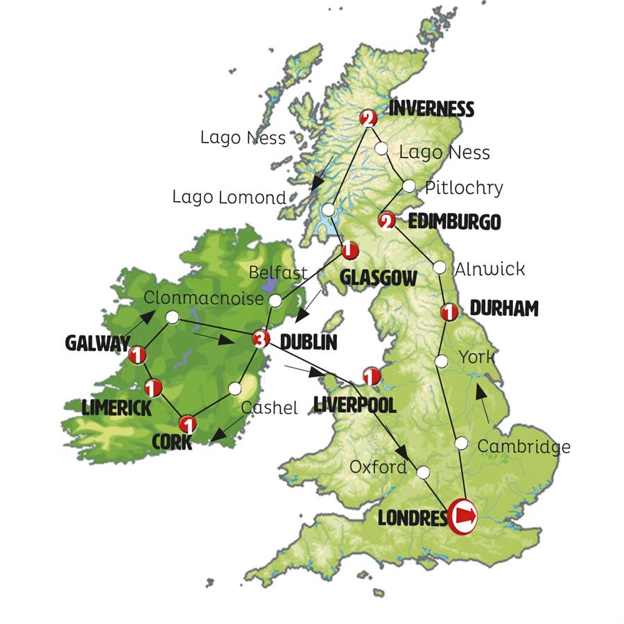Londres, Cambridge, York, Durham, Alnwick, Edimburgo, los kelpies, Stirling, Pitlochry, culloden, Inverness, Fort William, Inveraray, Lago Lomond, Glasgow, belfast, Dublin, Powerscourt, Kilkenny, Cashel, Cork, Kinsale, Killarney, Limerick, Acantilados de Moher, Galway, Clonmacnoise, Caernarfon, Liverpool, stratford, Oxford.