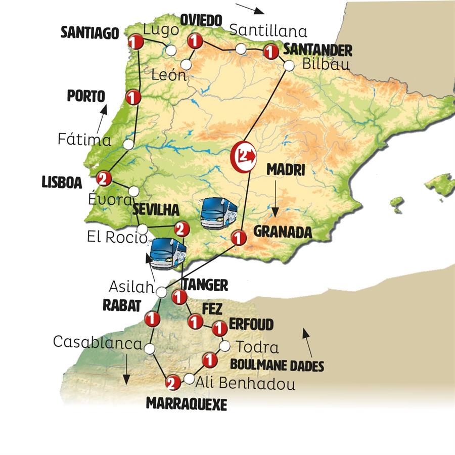 Madrid, Granada, Tânger, assilah, Rabat, Casablanca, Marrakech, ait ben hadu, Ouarzazate, Boumalne Dadès, Todra, Erfoud, Fes, Sevilha, Merida, Évora, Lisboa, Fátima, Porto, Santuario do Bom Jesus, Cambados, Santiago de Compostela, Lugo, Cebreiro, León, Oviedo, Covadonga, Santilhana, Santander, Bilbao, Area de Serviço Foronda.